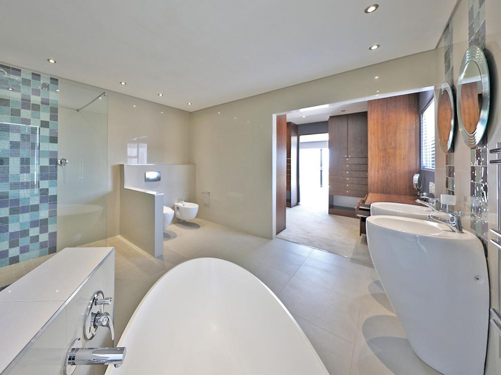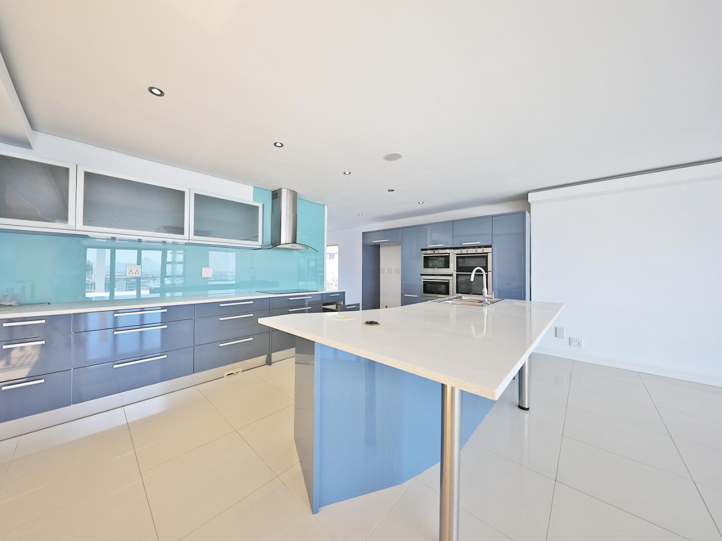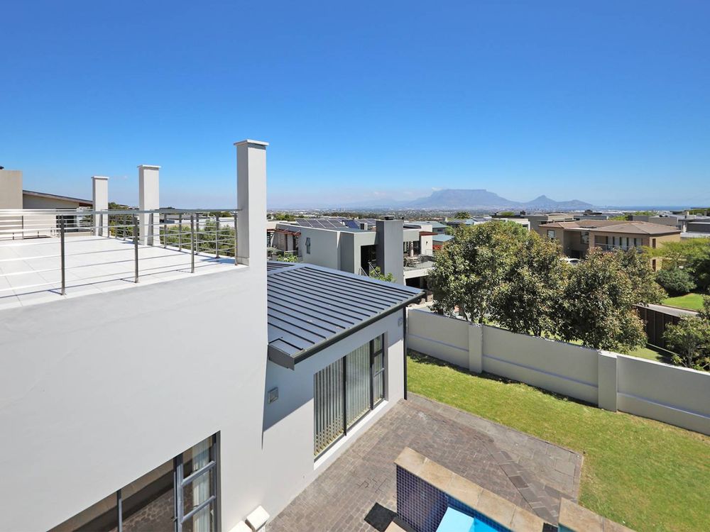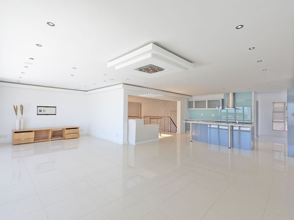 The upper level has an open-plan kitchen which has two ovens, a steamer, numerous counter tops and a separate scullery. The living area leads out to a deck from which the magical views of Table Mountain and the ocean can be enjoyed. The spacious main bedroom has an en-suite and dressing room.