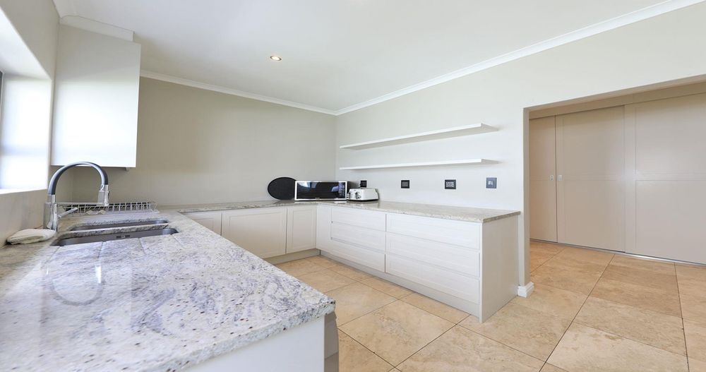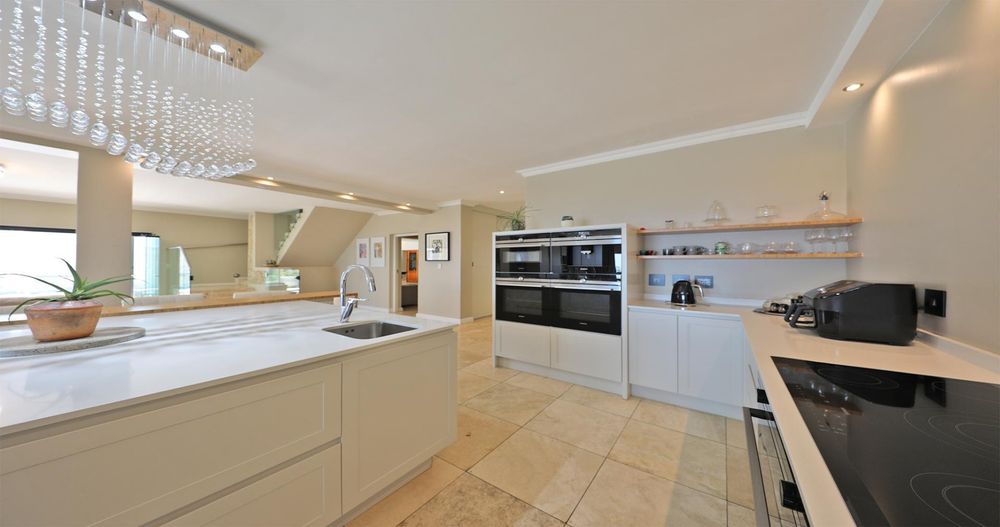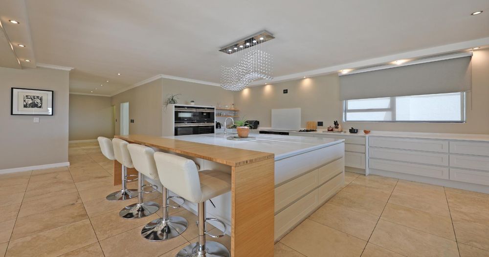 The heart of the home is a large, open-plan gourmet kitchen, featuring sleek Caesarstone countertops and top-of-the-line Siemens appliances, including four convection ovens, a built-in coffee machine, and a microwave. A separate scullery, pantry, and three expansive living areas ensure convenience and effortless entertaining.