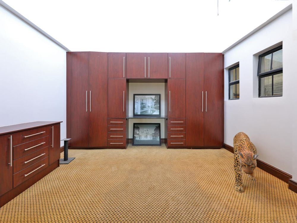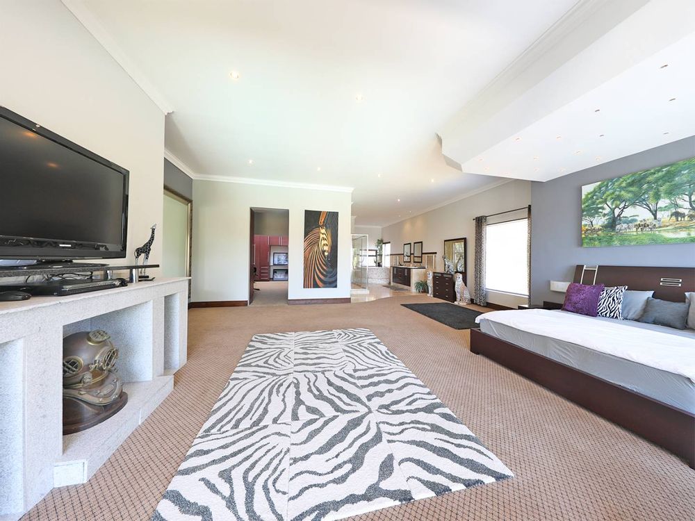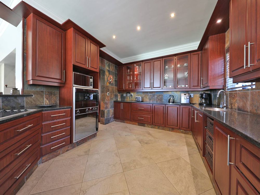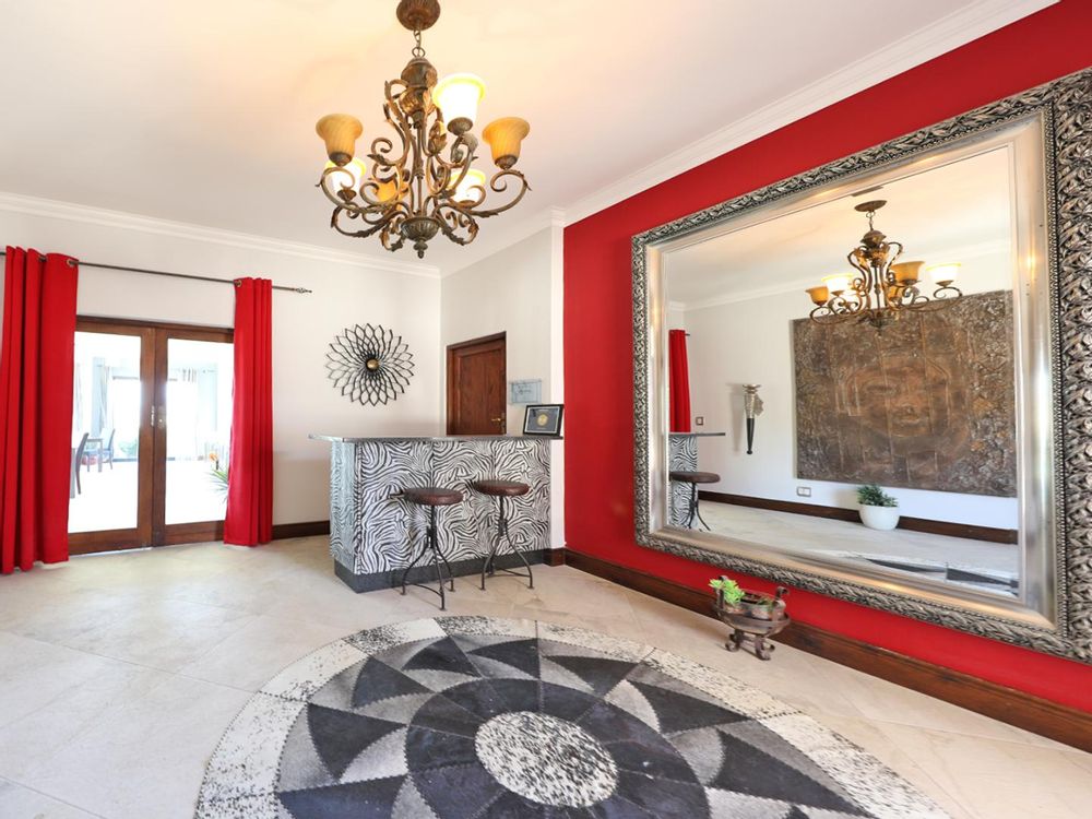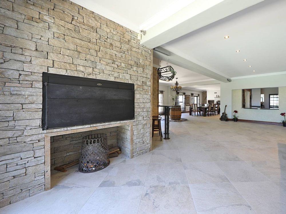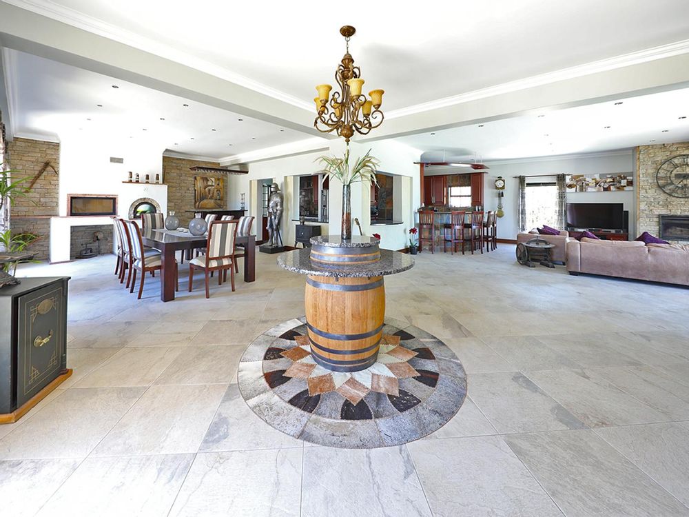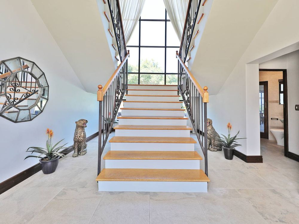 The luxurious main house with designed interiors offers 5 bedrooms. The main bedroom has an en-suite bathroom with built-in cupboards and a walk-in closet. Two of the bedrooms share a full bathroom. The remaining two bedrooms each have an en-suite. Furthermore, the house offers a wine cellar, an indoor braai with a pizza oven.
