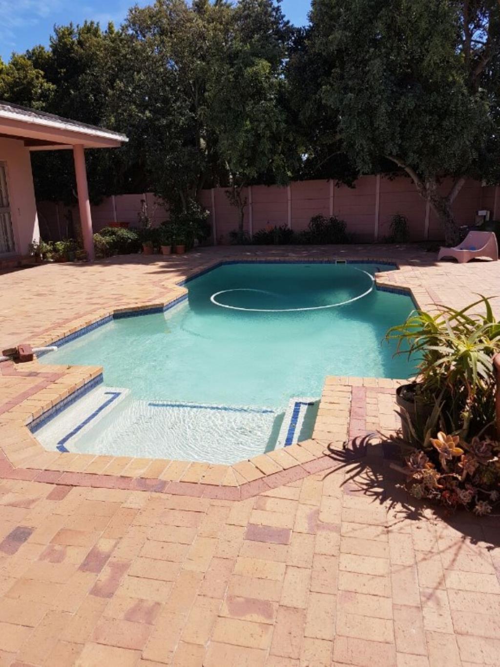 Outside, there is a swimming pool and a double garage. The home is ideally situated close to schools, hospitals, and shopping centres, making it a convenient choice for family living.