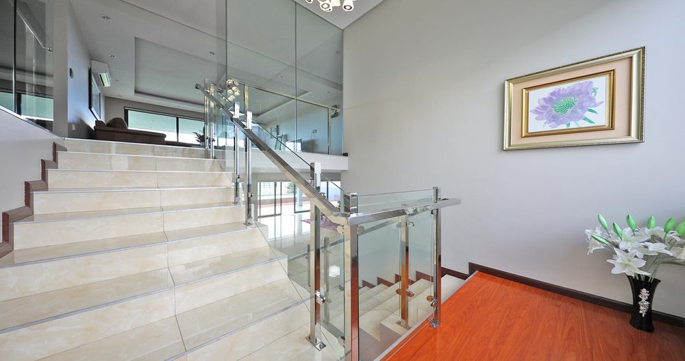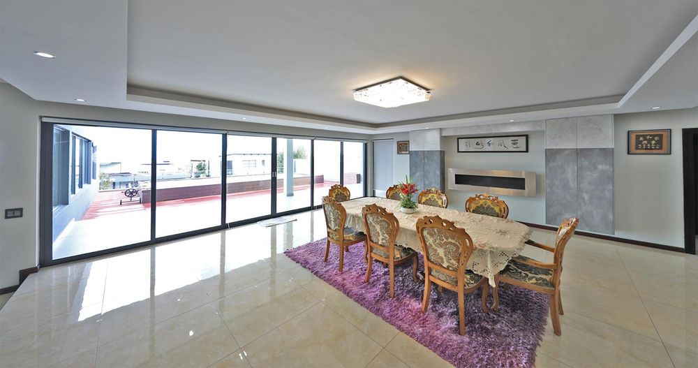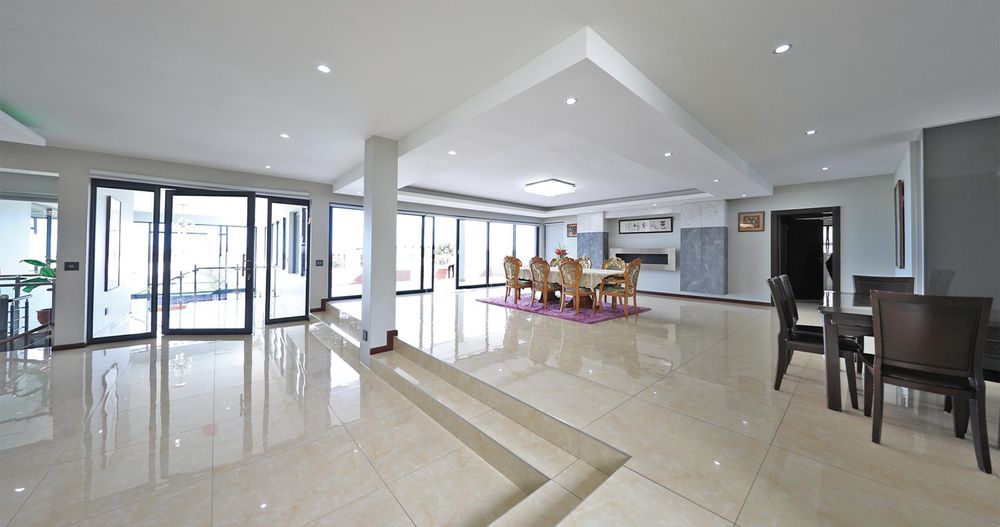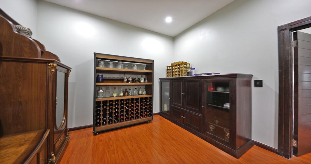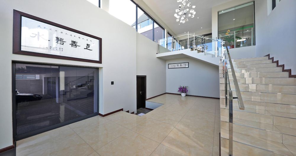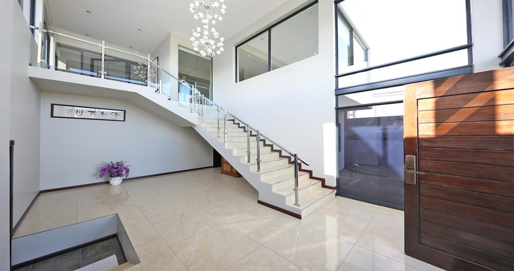 The grand entrance features a dramatic triple-volume, glass-clad foyer that leads to a striking stairway, a fully furnished study, a wine cellar, and a spacious storage room.