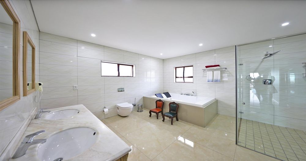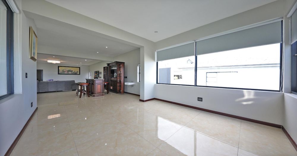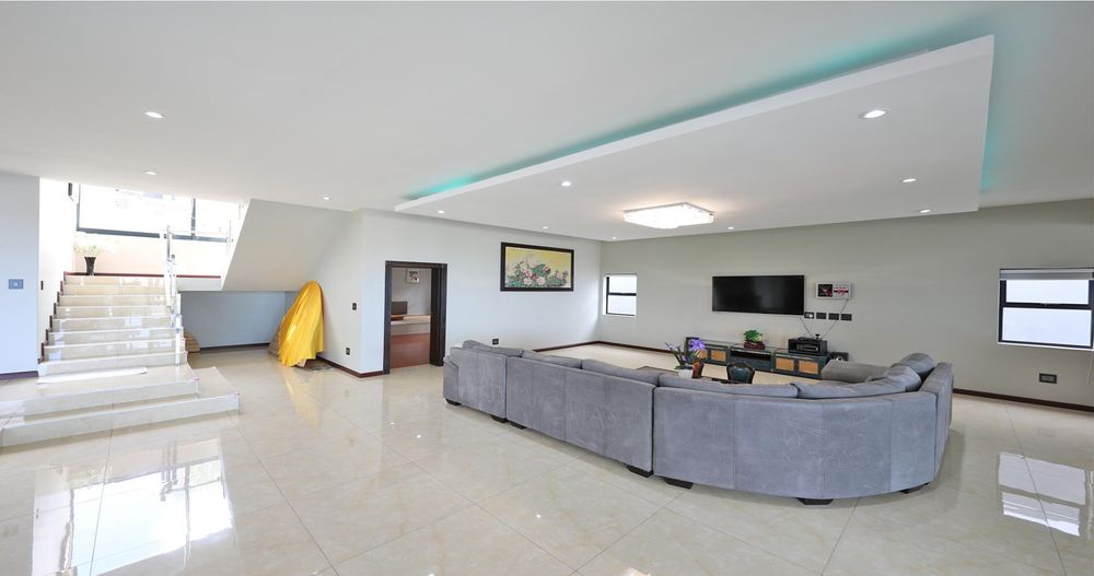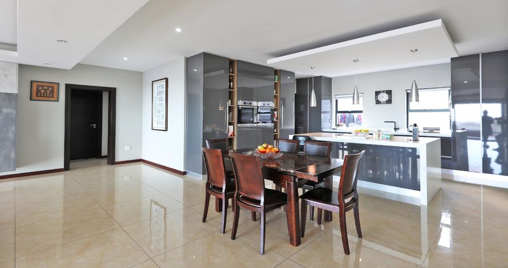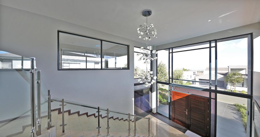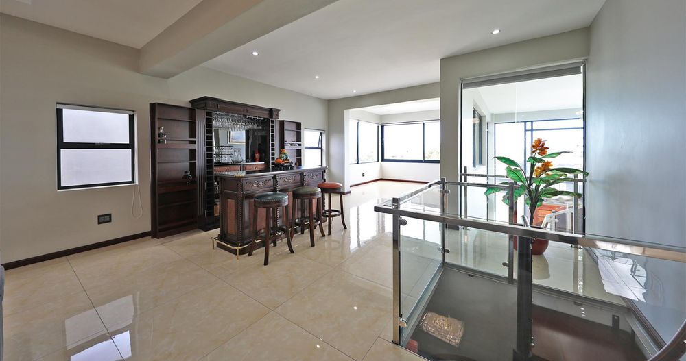 Ascending the elegant stairs, you'll find three expansive open-plan reception areas, a designer gourmet kitchen fitted with top-tier appliances, and a scullery of equal grandeur. This level also boasts a large bedroom with an en-suite bathroom and a dressing room. Every room offers breathtaking panoramic views of Cape Town and the ocean.