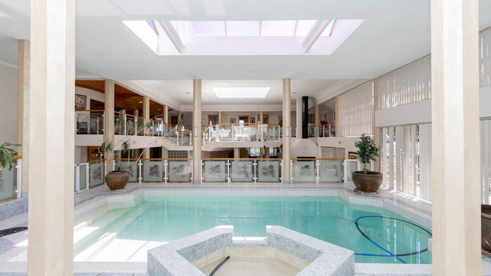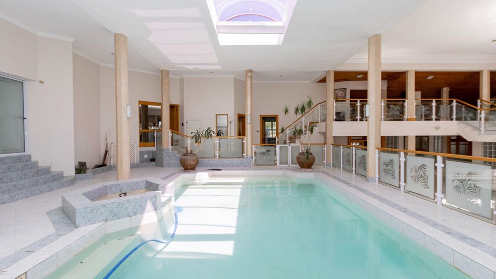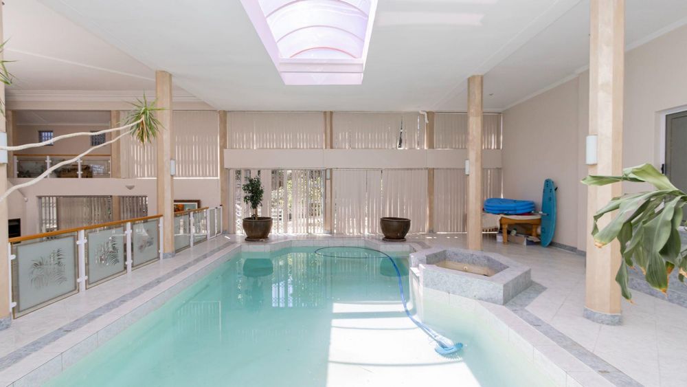 Stairs lead you to a very uniquely designed floating lounge. This home truly takes open-plan living to a whole new level with its TV room being positioned beneath the floating lounge which leads you to a spacious modern kitchen, braai area as well as an entrance to a beautiful indoor pool and sauna. It includes optional living areas - a more private and elegant lounge and bar area along for those days of catering for the entire family.